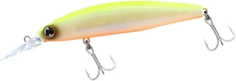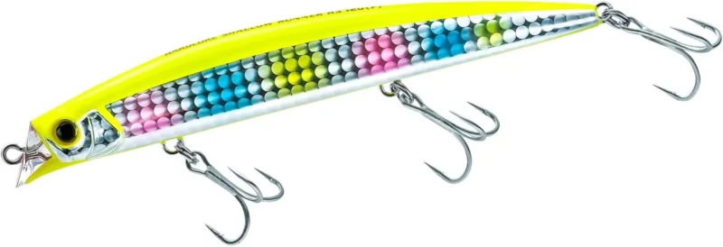 潜行レンジは約1mで、マズメ後にレンジが下がった太刀魚をミノーの巻きで攻略したい場面に最適。カラーは26色展開と豊富で、太刀魚に効くレッドヘッドやチャート系も揃っています。