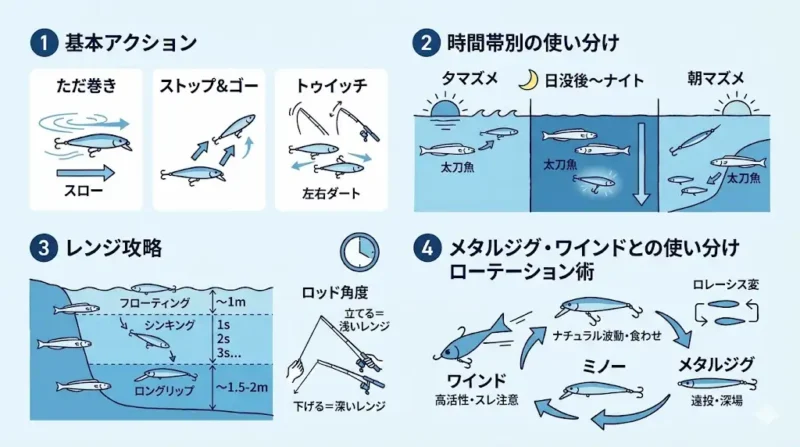 ここではアクションの種類、時間帯別の使い分け、レンジ攻略、他のルアーとのローテーション術を紹介します。