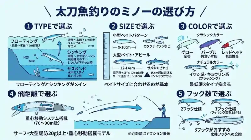 太刀魚用ミノーは種類が多く、タイプ・サイズ・カラー・飛距離など選ぶポイントがいくつもあります。どれを買えばいいか迷ってしまう方も多いでしょう。ここでは初心者〜中級者が失敗しないために、押さえておきたい選び方のポイントをそれぞれ紹介します。