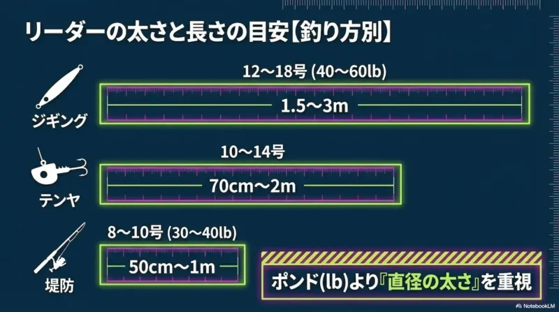 ジギングではフロロカーボン40〜60lb(12〜18号)を1.5〜3mの長さで使い、PEラインとの結束にはFGノットが定番です。テンヤ(船)ではフロロまたはナイロン10〜14号が主流で、長さは70cm〜2m程度。テンヤに付属しているリーダーでも基本的には問題ありません。堤防(ショア)ではフロロ30〜40lb(8〜10号)を基準に、ワインドや引き釣りなら50cmから1m程度の長さで組みましょう。