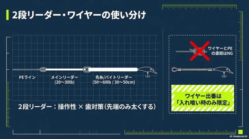 ワイヤーリーダーの出番は「入れ喰い状態」や「大型ばかりの高活性時」など、歯切れリスクが極めて高い場面に限定するのが賢い使い分けです。なお、PEラインとワイヤーを直結するとショック吸収ができないため、間にフロロまたはナイロンのリーダーを介するのが鉄則です。