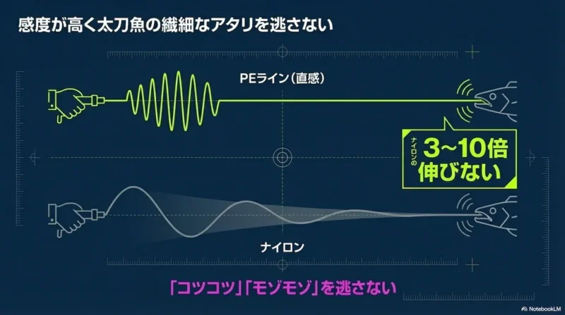 太刀魚のバイトは独特で、「コツコツ」「モゾモゾ」といった小さな前アタリが多いのが特徴です。感度が低いラインではこうした前アタリを見逃し、フッキングのタイミングを失ってしまいます。