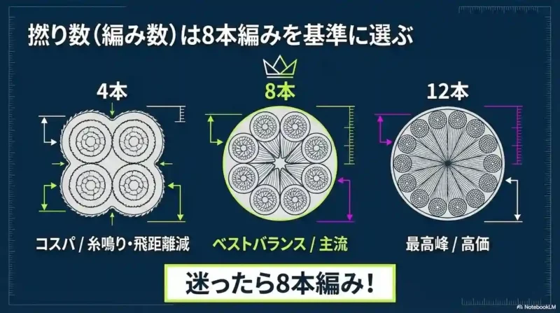 初心者〜中級者はコスパと性能のバランスに優れた8本編みを選んでおけば間違いありません