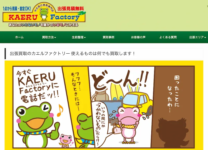 | KAERU Factory(カエルファクトリー) | 座間市拠点、地域密着型。1点から出張料無料で買取。 | 出張買取 | 出張料、査定料すべて無料。 | https://kaerufactory.co.jp |