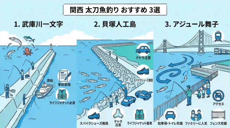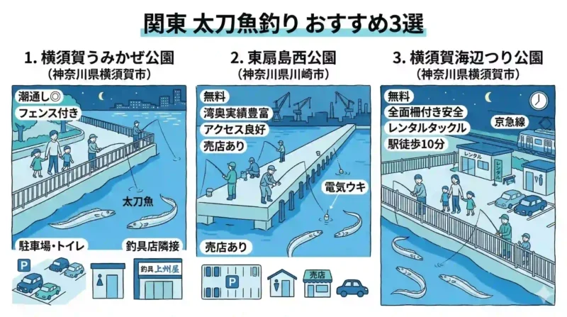 ここからは、太刀魚の実績が豊富な具体的な釣り場を関東・関西に分けて紹介します。いずれも太刀魚シーズンになると多くのアングラーが訪れる定番の人気釣り場で、初心者でもアクセスしやすい場所を厳選しました。