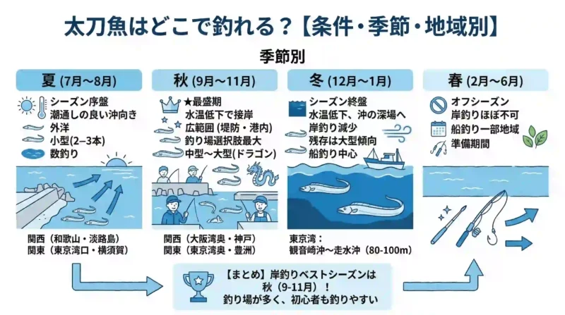 まとめると、岸から太刀魚を狙うなら「秋(9〜11月)」が最も釣り場の選択肢が多く、初心者でも釣果を出しやすいベストシーズンといえます。