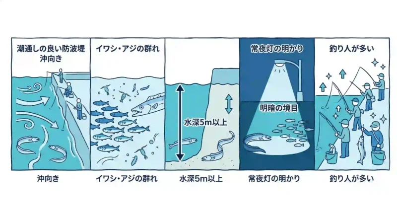 太刀魚が釣れる場所には、いくつかの共通した条件があります。闇雲に釣り場を選ぶのではなく、これから紹介する5つの条件を意識するだけで、釣果は大きく変わってきます。