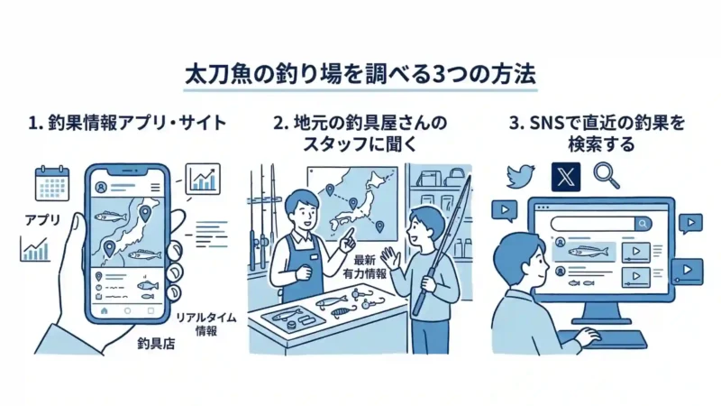ここでは、リアルタイムで太刀魚の釣れている場所を調べる具体的な方法を3つ紹介します。